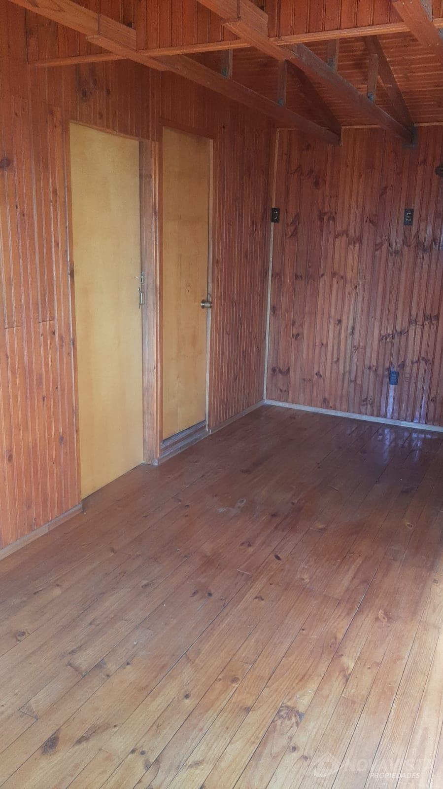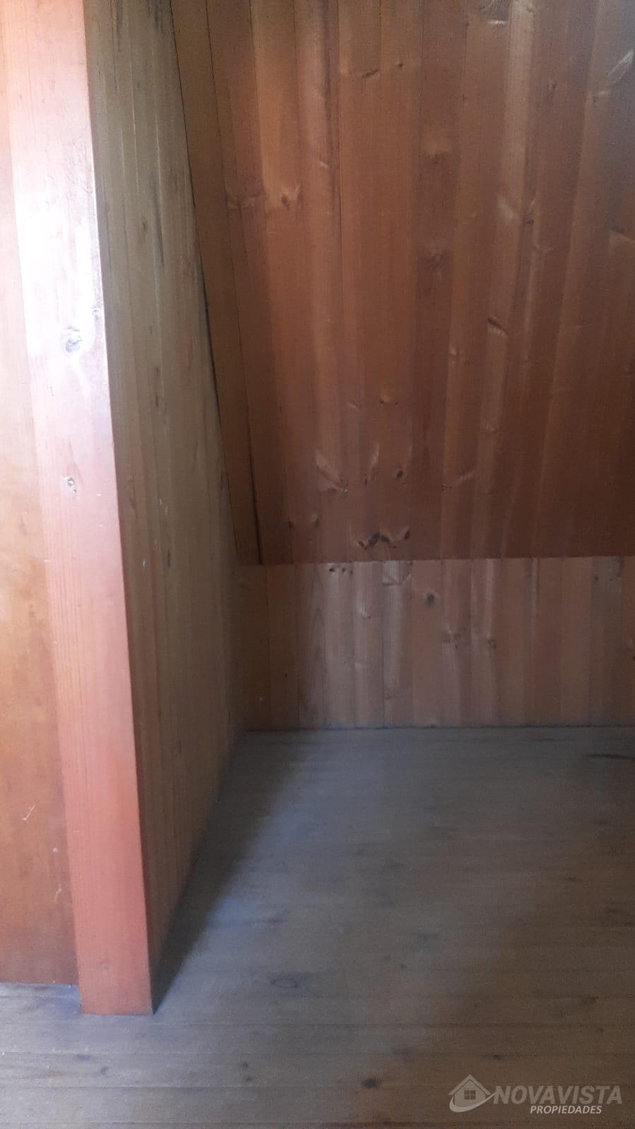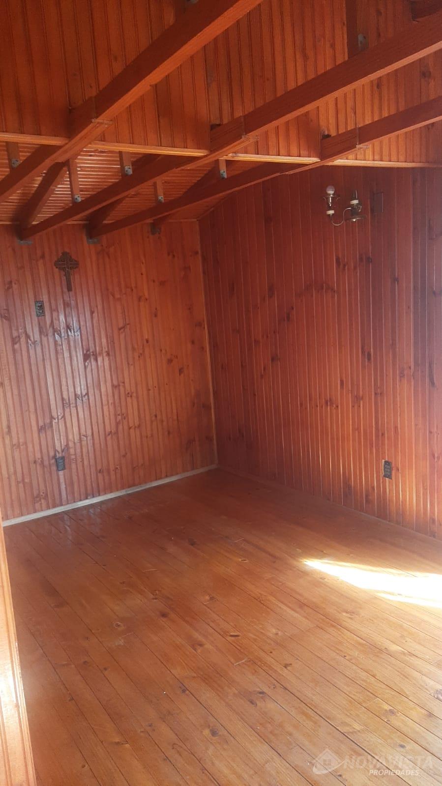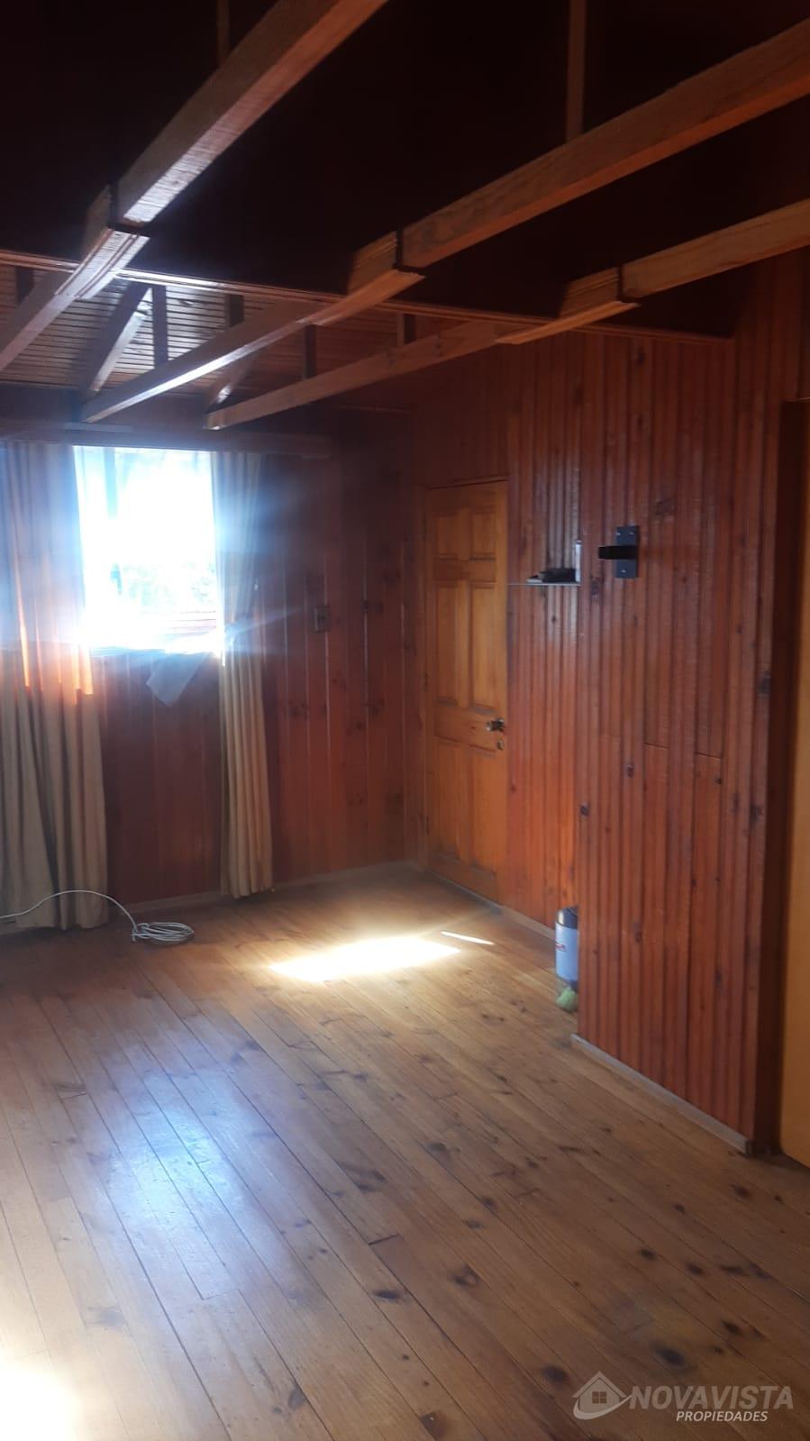 Casa con una superficie total de 207 m² y una superficie útil de 171 m², distribuida en dos niveles. La propiedad cuenta con cinco dormitorios y dos baños, ofreciendo espacios adecuados para familias numerosas o quienes requieren ambientes adicionales para oficina o estudio. El diseño interior destaca por el uso de madera en pisos, paredes y techos, generando una estética uniforme en los distintos ambientes. La cocina está equipada con muebles de madera, cubierta de granito y campana extractora, además de una ventana que permite ventilación natural. Los espacios comunes incluyen un living con estufa a leña y comedor, ambos con terminaciones en madera y acceso a luz natural mediante ventanas. La casa dispone de una escalera de madera que conecta los niveles, y los dormitorios presentan acabados similares, con puertas y paredes de madera. El exterior cuenta con un cierre perimetral de madera y portón, brindando privacidad y delimitación del terreno