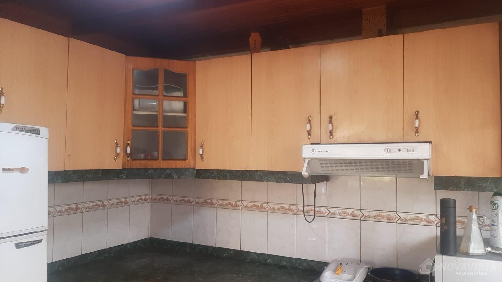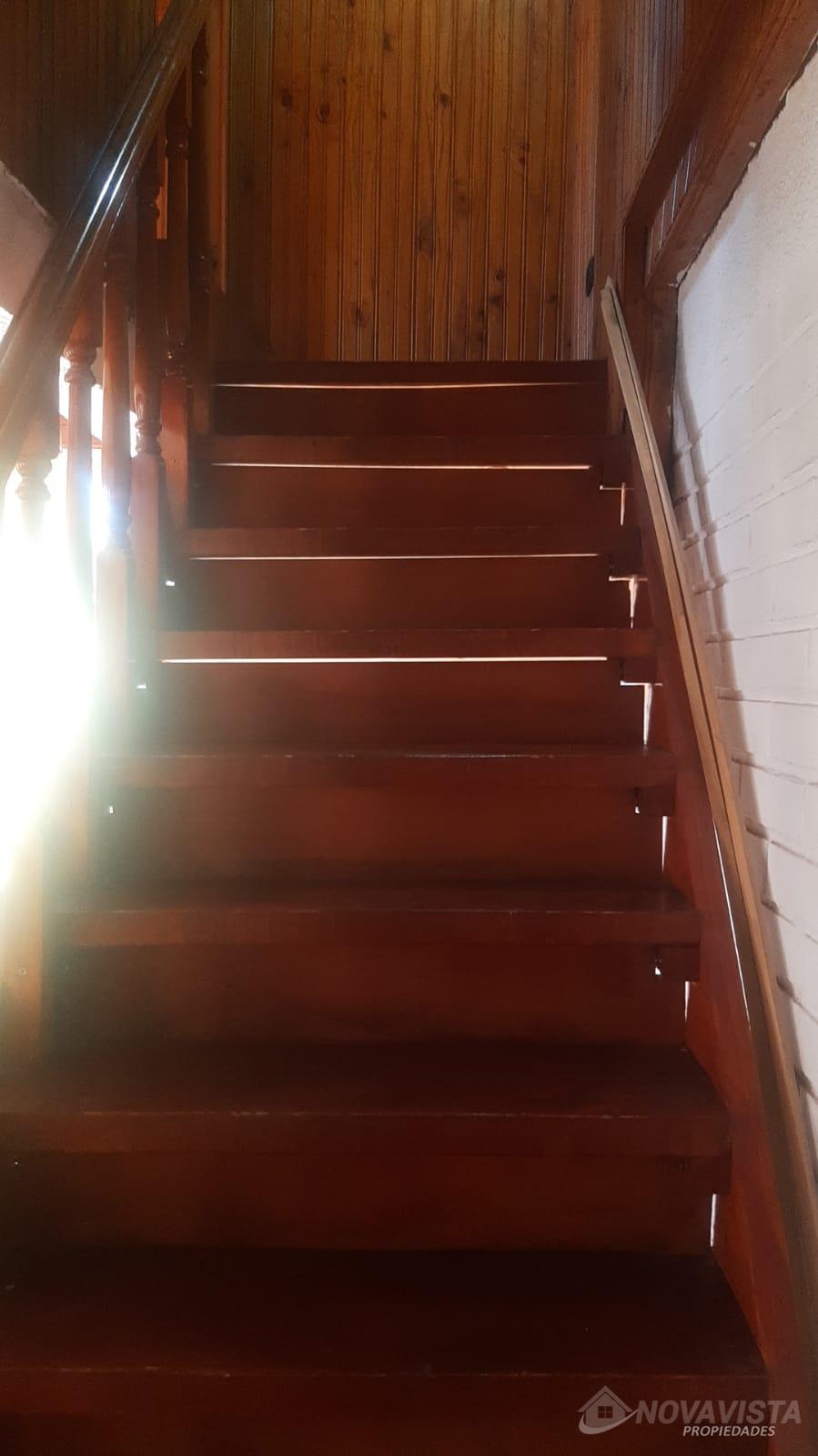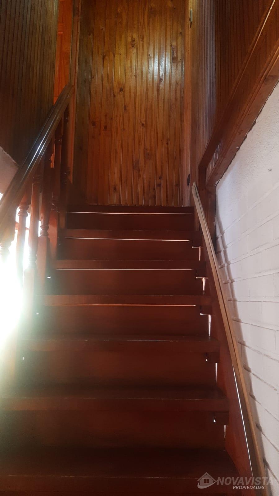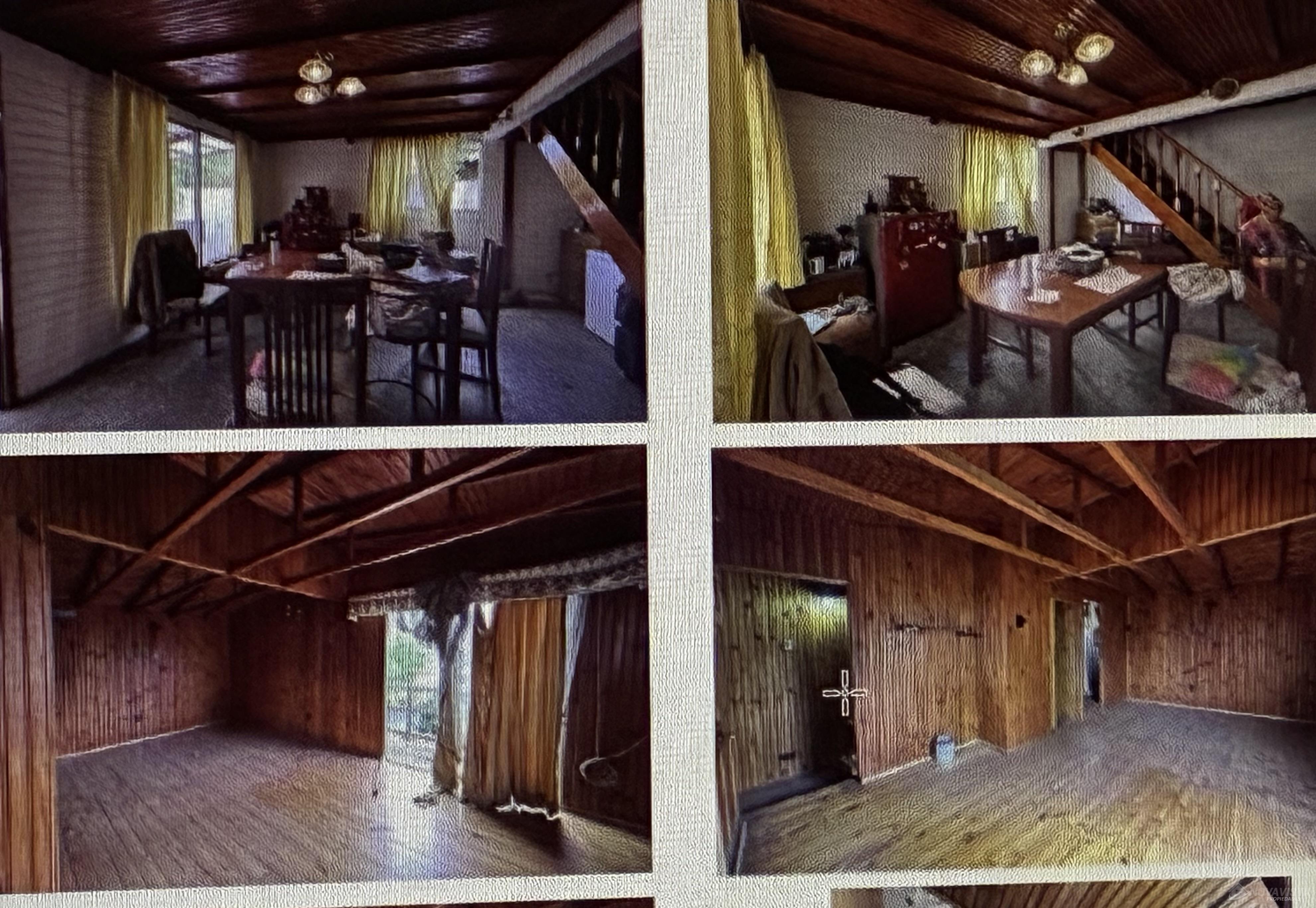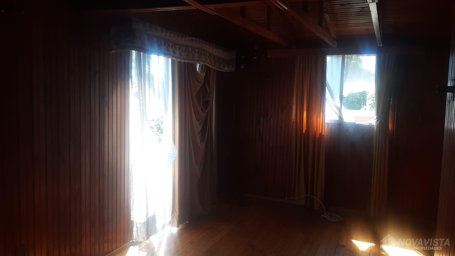 Casa con una superficie total de 207 m² y una superficie útil de 171 m², distribuida en dos niveles. La propiedad cuenta con cinco dormitorios y dos baños, ofreciendo espacios adecuados para familias numerosas o quienes requieren ambientes adicionales para oficina o estudio. El diseño interior destaca por el uso de madera en pisos, paredes y techos, generando una estética uniforme en los distintos ambientes. La cocina está equipada con muebles de madera, cubierta de granito y campana extractora, además de una ventana que permite ventilación natural. Los espacios comunes incluyen un living con estufa a leña y comedor, ambos con terminaciones en madera y acceso a luz natural mediante ventanas. La casa dispone de una escalera de madera que conecta los niveles, y los dormitorios presentan acabados similares, con puertas y paredes de madera. El exterior cuenta con un cierre perimetral de madera y portón, brindando privacidad y delimitación del terreno